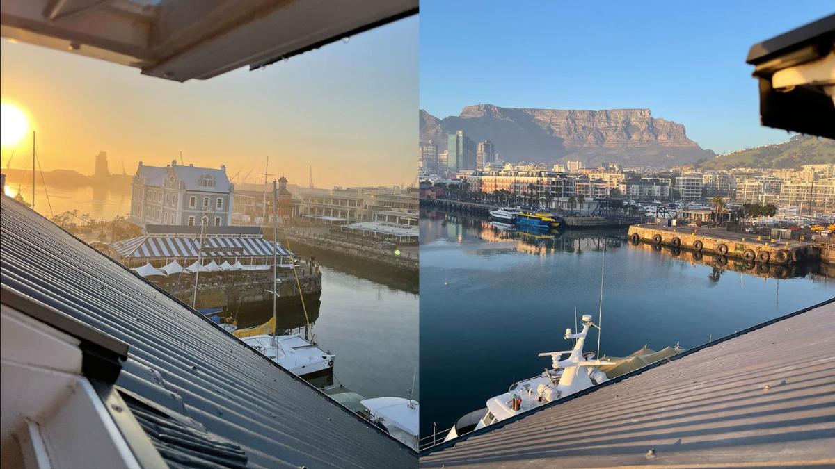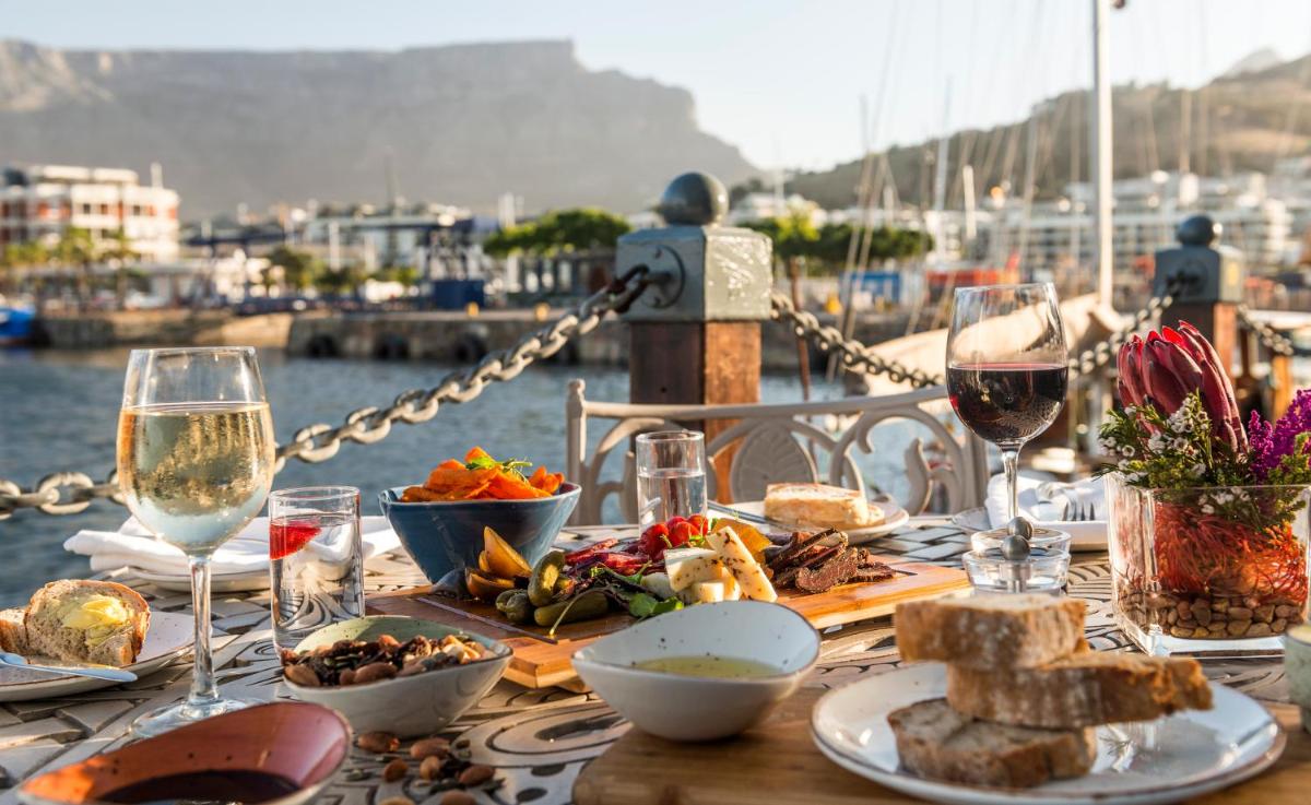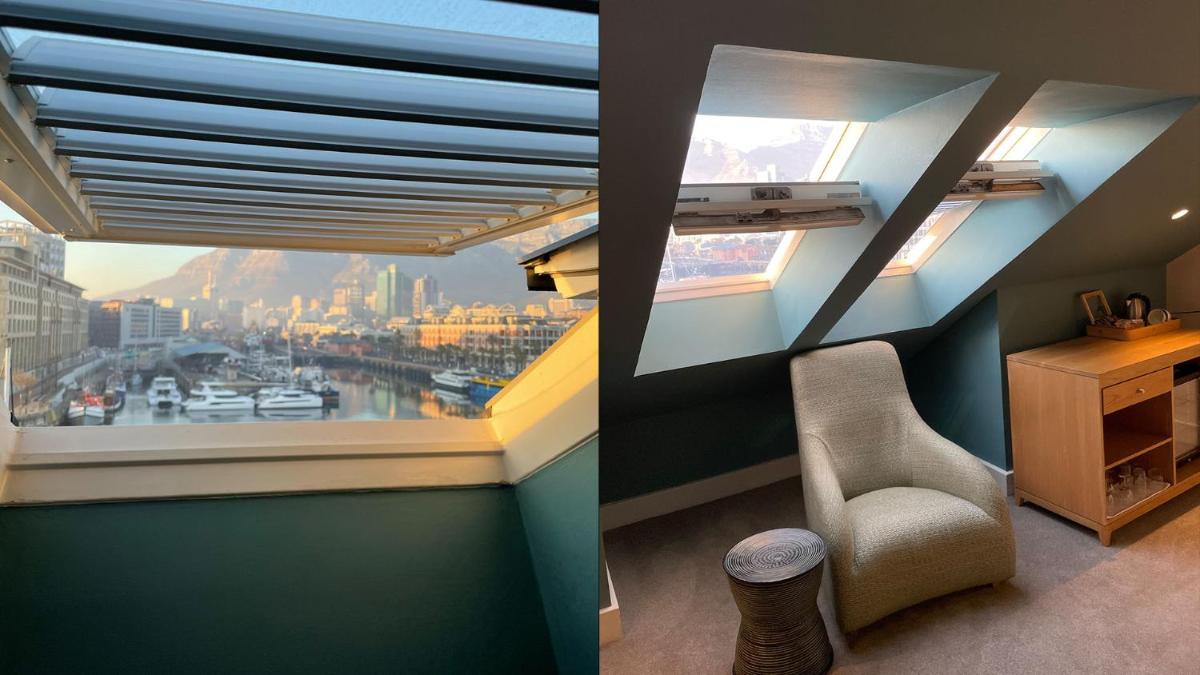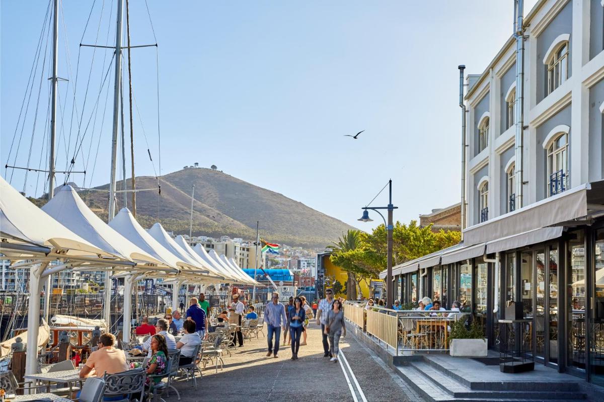 Photos capture the restored warehouse’s industrial charm, softened by contemporary interiors. Guestrooms show bright, spacious layouts with window views over the Waterfront or Table Mountain. Ginja Restaurant’s terrace features harbor seating, while the lounge bar offers a moody, stylish atmosphere. Evening shots highlight Cape Town’s skyline and the mountain beyond.
