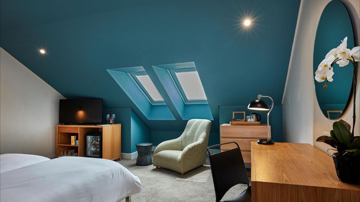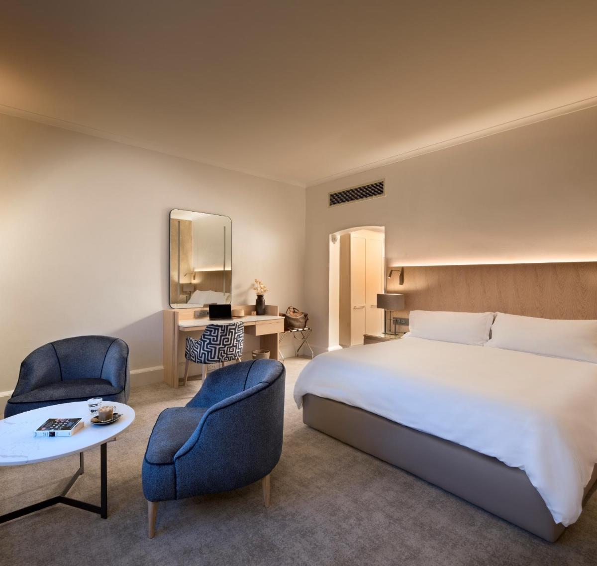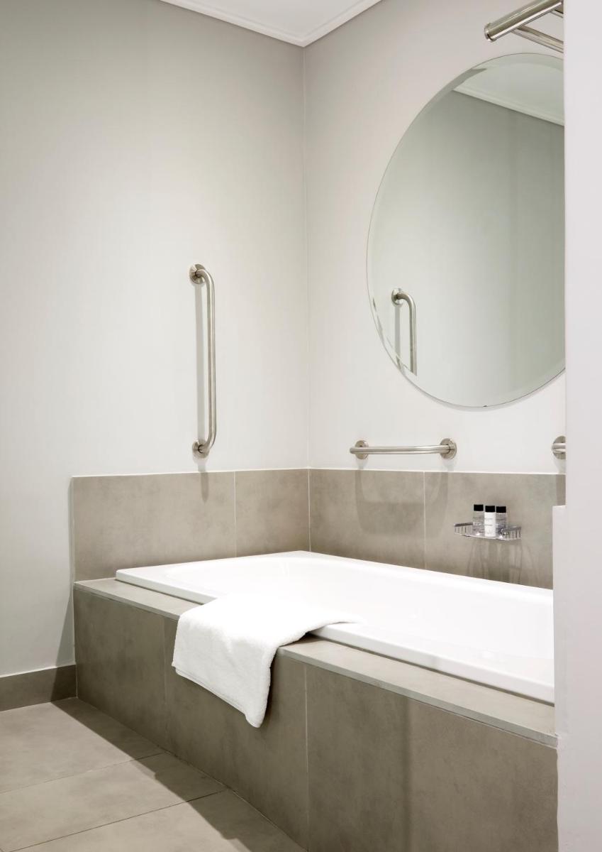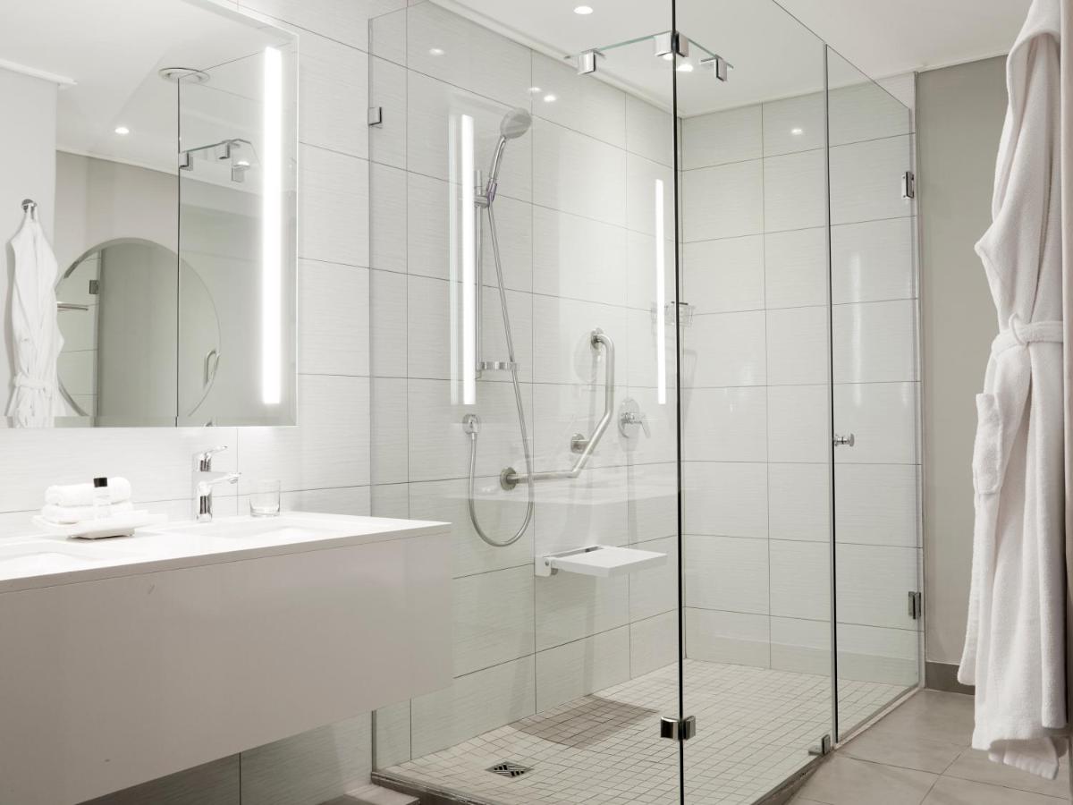 Photos capture the restored warehouse’s industrial charm, softened by contemporary interiors. Guestrooms show bright, spacious layouts with window views over the Waterfront or Table Mountain. Ginja Restaurant’s terrace features harbor seating, while the lounge bar offers a moody, stylish atmosphere. Evening shots highlight Cape Town’s skyline and the mountain beyond.